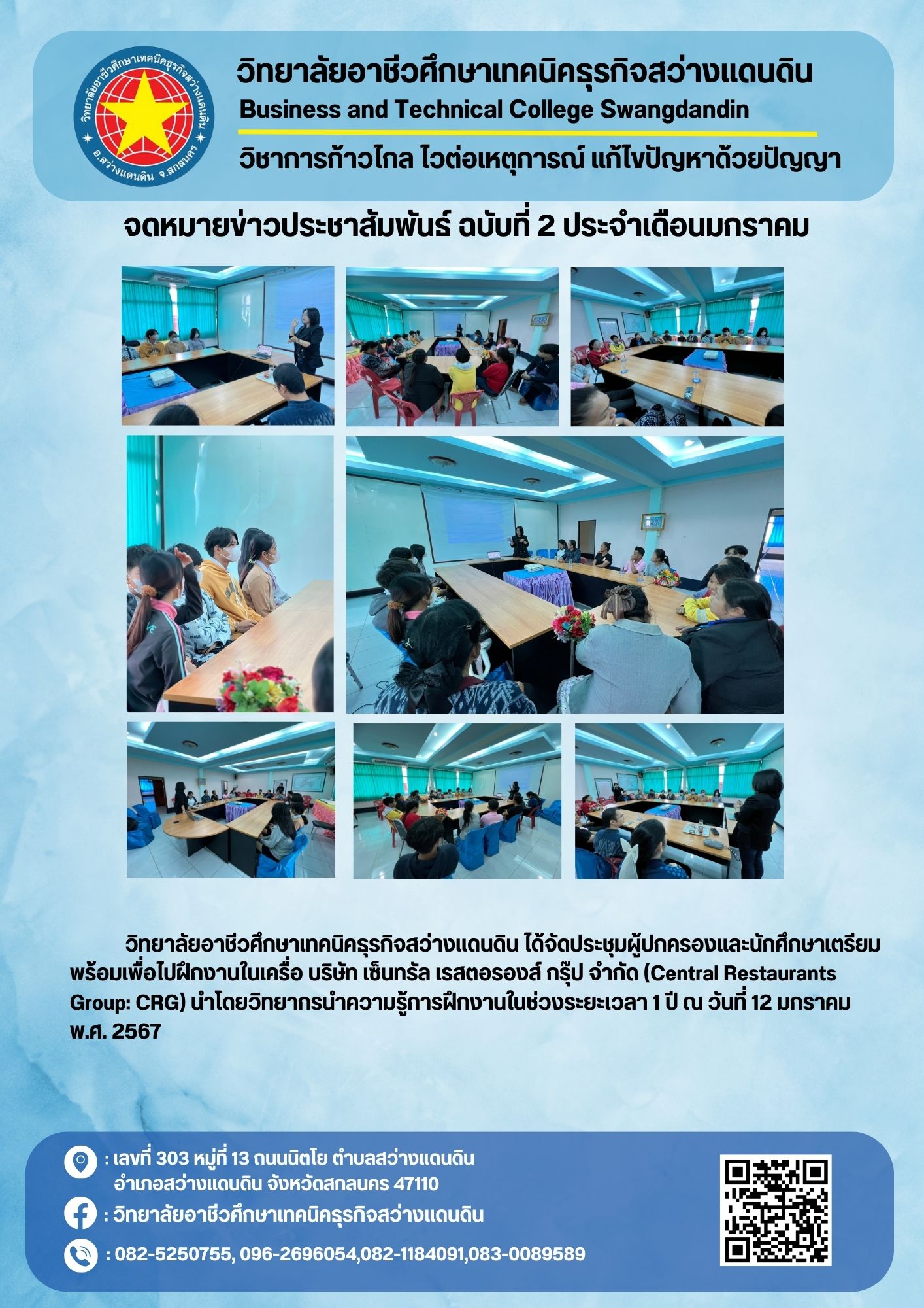 วิทยาลัยอาชีวศึกษาเทคนิคธุรกิจสว่างแดนดิน ได้จัดประชุมผู้ปกครองและนักศึกษาเตรียมพร้อมเพื่อไปฝึกงานในเครื่อ บริษัท เซ็นทรัล เรสตอรองส์ กรุ๊ป จำกัด (Central Restaurants Group: CRG) นำโดยวิทยากรนำความรู้การฝึกงานในช่วงระยะเวลา 1 ปี ณ วันที่ 12 มกราคม พ.ศ. 2567