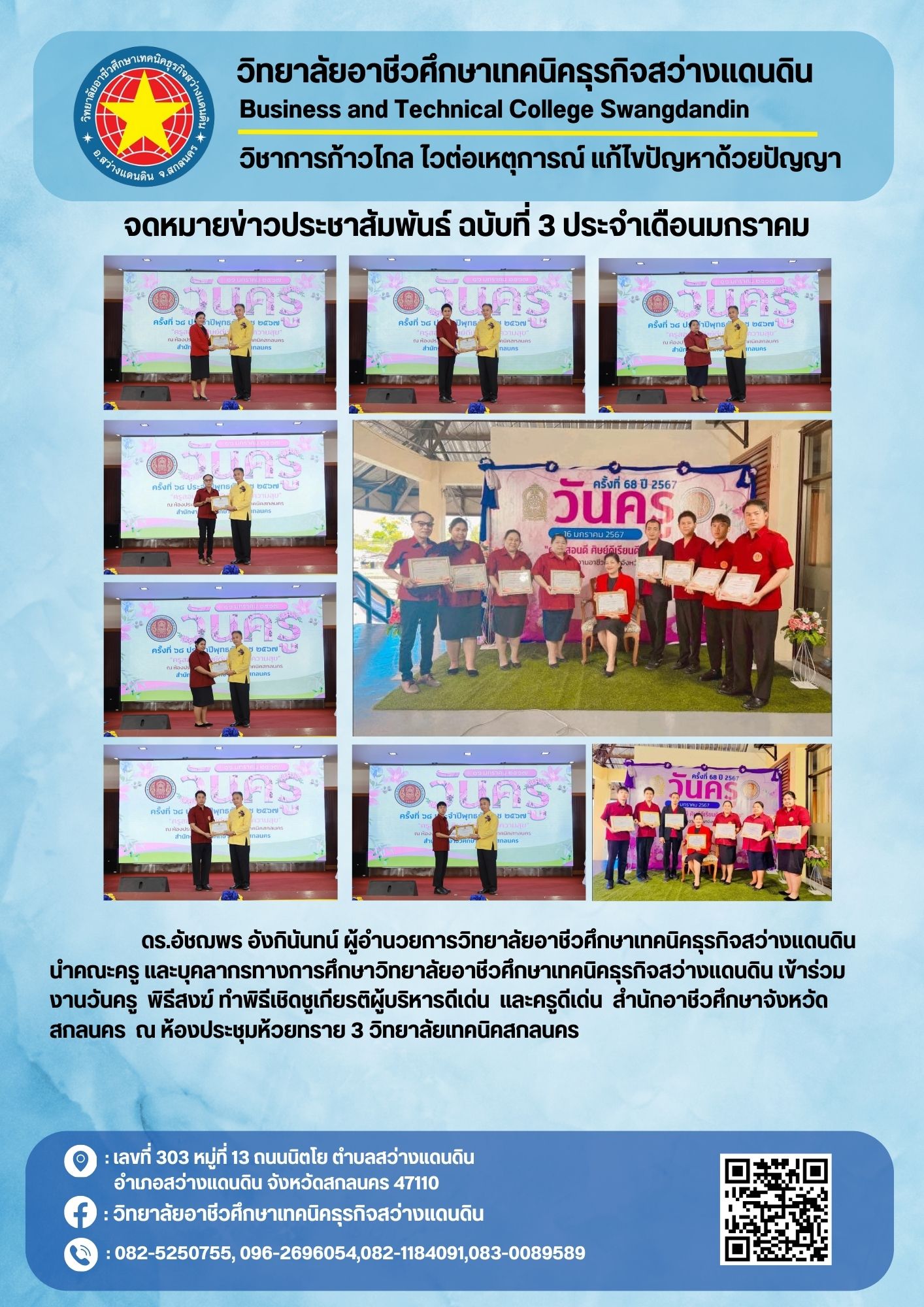 ดร.อัชฌพร อังกินันทน์ ผู้อำนวยการวิทยาลัยอาชีวศึกษาเทคนิคธุรกิจสว่างแดนดิน นำคณะครู และบุคลากรทางการศึกษาวิทยาลัยอาชีวศึกษาเทคนิคธุรกิจสว่างแดนดิน เข้าร่วมงานวันครู พิธีสงฆ์ ทำพิธีเชิดชูเกียรติผู้บริหารดีเด่น และครูดีเด่น สำนักอาชีวศึกษาจังหวัดสกลนคร ณ ห้องประชุมห้วยทราย 3 วิทยาลัยเทคนิคสกลนคร